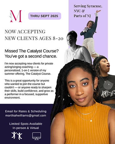 Designed by Martikah, The Catalyst Course is a catered to you training program for youth actor/singers who want to further their artistry in preparation for auditions and rigorous theater training. Through workshops, one-on-one coaching and a masterclass facilitated by Martikah, artists will learn best methods for warming up, audition prep, and become callback ready. In its first year Martikah invites two talented guest instructors, Robert Edwards (Scene Study) and Keesean Skinner (Self-Taping), to enhance course offerings. The course culminates in a filming day where students can support each other through filming scenes together.